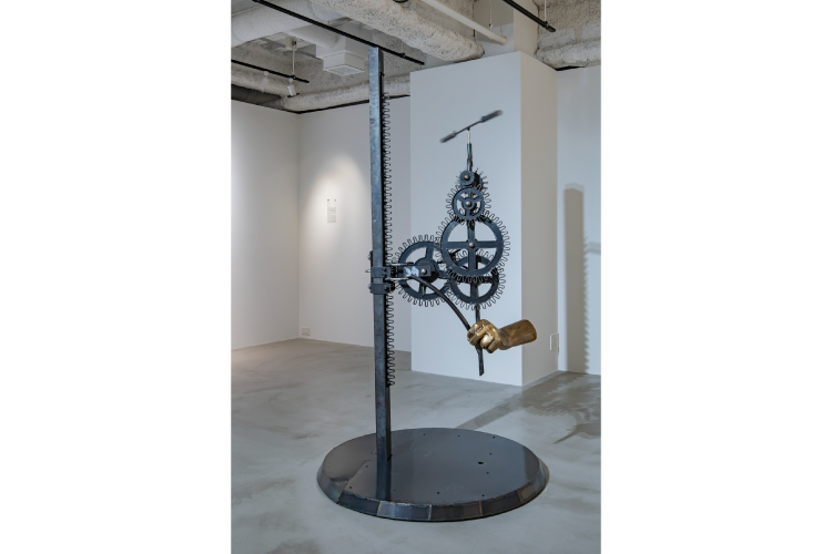 主に金属を素材とした動く彫刻作品を制作している。 作品には、13世紀以降の機械式時計に用いられてきた「脱進機(エスケープメント)」の構造を取り入れて いる。時計は本来、効率、生産性を高めるために使用されてきたものだが、私はそれを「スピードを遅くす るための構造」として捉え直す。現代社会が技術の進歩とともに加速し、自然の時間感覚から乖離していくな かで、私は脱進機を時間を減速させる装置として再構築し、効率や生産性を追求する近代以降の価値観に対 する逆説的な批評性を込めて彫刻として提示する。