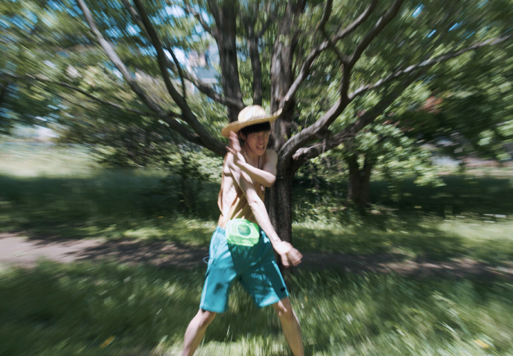 エンターテイメントへの批評性のもと自らが主演・演出を手がけた映像インスタレーションを制作している。TVドラマ、MV、あるいは映画といった広く知られた娯楽を引用して、真似るという原初的な誇張により笑いを巧みに引き起こす。日用品を取り入れた舞台装置や衣装を即席的につくり、日常世界を愉快なショウへと変容させて、自らが即興的にリズミカルな音を発することで意味/無意味のおかしさを暴露していく。倉知は笑いを基底とした芸術表現によって、近代以降に生まれた娯楽や人間性を実践的に自問する。