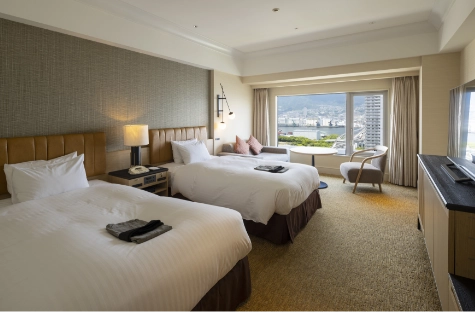 客室はすべて12階以上の高層フロア。ほぼすべてのお部屋からベイサイドならではの空と海、神戸の街の夜景をご覧いただけます。ベッドマットレスは西川のAir01を使用!朝食は世界各国のお料理が愉しめる「世界の朝食」をご用意!