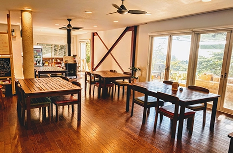 樹々に囲まれた建物の2階は最大18名収容の小さなゲストハウス。
